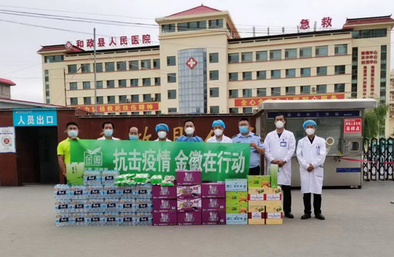 7月18日,疫情期间,和政县金鑫源商行联合金徽酒业有限公司,向和政县高速路口,疾控中心,县医院,市场监督管理局,县疫情指挥中心,和华艺小区,国税局小区,西关社区三个抗击疫情防控点,捐赠康师傅桶面60箱,矿泉水75件,茶叶20斤,名仁苏打水25箱,优酸乳6箱,四角大帐篷12顶,消毒酒精270瓶,纸杯一万个,共计价值2.2万元