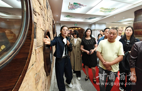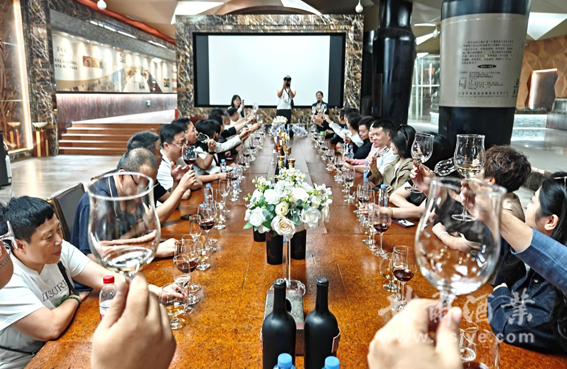 在莫高酒庄酒窖文化中心,莫高文化中心总经理李楠引领大家通过眼观、鼻闻等近距离方式,了解葡萄从品种、种植到酿造的全流程,沉浸式感受着葡萄酒厚重的历史底蕴与独特的文化脉络,引导大家共同品鉴了四款葡萄酒并进行交流洽谈。