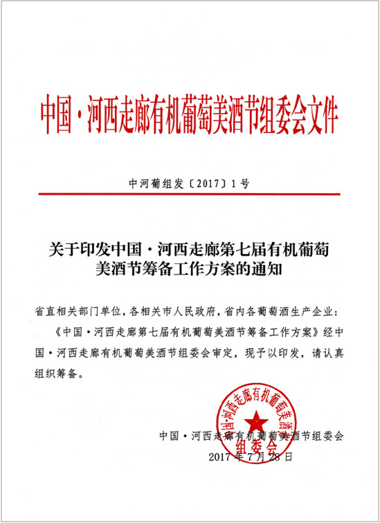 由甘肃省葡萄酒产业发展领导小组、武威市人民政府、甘肃省葡萄酒产业协会主办,武威市人民政府、甘肃省葡萄酒产业协会承办的中国・河西走廊第七届有机葡萄美酒节,2017年9月16日至20日在武威市举行。