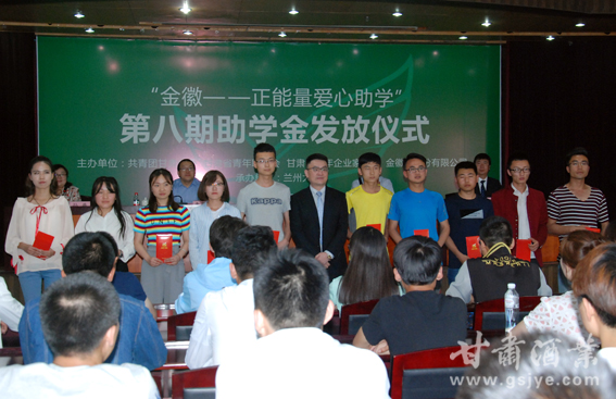 5月27日下午,由共青团甘肃省委、甘肃省青年联合会、甘肃省青年企业家协会、金徽酒股份有限公司共同主办,兰州大学承办的“金徽正能量爱心助学第八期助学金发放仪式”在百年高校兰州大学隆重举行。团省委学校部部长杨成,团省委城市青年工作部副部长孙燕、兰州大学团委书记李华龙,金徽酒股份有限公司董事、副总经理王栋,以及西北师范大学、兰州交通大学、兰州财经大学、甘肃政法学院等有关院校负责人及受资助学生、新闻媒体共同出席此次活动。