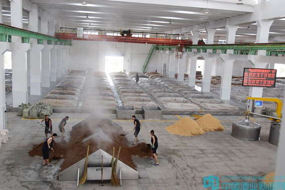 在金徽酒908酿酒车间,记者透过参观走廊的玻璃窗看到,发酵车间中诸多身穿工服的一线酿酒师正在忙于堆料、一锨一锨将粮食原料堆好,形成规范化的等椎体形状。不同于一般白酒酿酒车间的脏乱差,在这里,即便处于繁忙的生产期,除了原粮堆料与各种生产工具和设备之外,地面干干净净,不见一丝杂物。