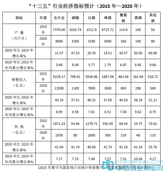 到2020年,全行业预计实现酿酒总产量 8960万千升(含酒精及白、啤、葡、黄、其他酒等六个子行业),比2015年7370.06万千升增长21.57%,年均复合增长3.98%;销售收入达到12938亿元,比2015年9229.17亿元增长40.19 %,年均复合增长6.99 %;利税2658亿元,比2015年1871.24亿元增长42.04%,年均复合增长7.27%。