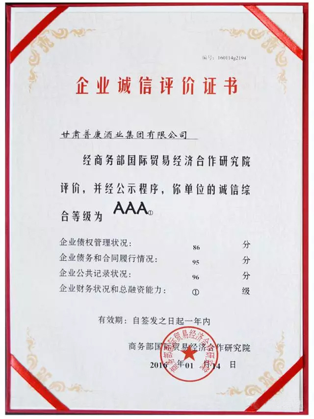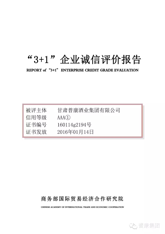 甘肃普康酒业集团有限公司“3+1”诚信评价结果是根据商务部研究院“3+1”诚信评价体系标准而得出。“3+1”诚信评价体系标准是指依据有关法律法规,参照国际通行的评价惯例,并结合中国市场经济和中国企业的实际特点,设定诚信评估模型,按照一定程序,将参与市场交易的各类企业的债权管理信息、债务和合同履行信息、公共记录信息、财务信息收集起来,经过科学、合理、公正、权威的评价,分别确定其诚信等级并予以公示的一种制度。对于未达标的企业,指导其通过规范企业内业务和管理的流程,从而提高企业诚信管理能力,改善企业对外偿付习惯,扩大企业对外的诚信度,逐步帮助企业达到诚信等级标准。