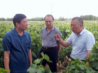 李忠平(左一)在祁连葡萄庄园向公司董事长杨映(右一)了解葡萄种植情况
