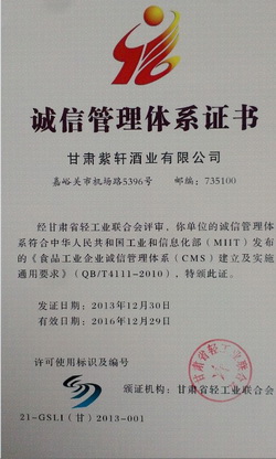 紫轩酒业通过国家诚信管理体系认证