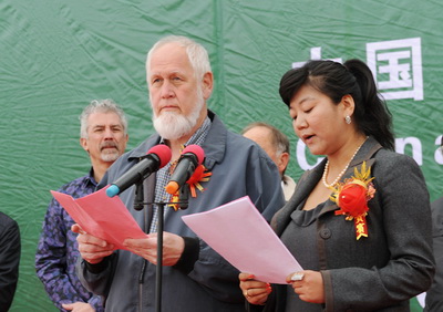 月色美地国际红酒与烈酒贸易集团董事长、世界著名葡萄酒大师肯尼斯・富森致辞,董事会秘书长苏珊女士担任翻译