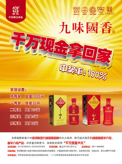 2013年, 九味国香将兰州市场作为核心转型市场,持续进行调整,取得显著成效。针对兰州市场发展需求,公司确定全面调整兰州市场产品,对备受兰州消费者喜爱、畅销3年之久的九味国香国字六号、国字八号产品两大核心主导大众类产品全面进行了促销升级。在4月20日起到2014年2月28日期间,凡在在市区零售网点上,购买九味国香国字六号、国字八号产品,刮开盒内的奖卡,就有机会获得“千元现金大礼”,此次共设特等奖、一等奖、 二等奖、三等奖、四等奖共五个奖项,奖励现金分别为:1000元、30元、10元、 5元、2元。