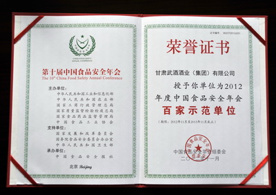2012年11月17日,在第十届中国食品安全年会上,凭借高品质的产品和系统的品控管理实践,甘肃武酒酒业(集团)有限公司被评为“中国食品安全百家示范单位”,公司总经理冯淑刚被授予“百名先进管理个人”称号。这既是对武酒集团的赞誉,更是对武酒严格践行质量管理的肯定。