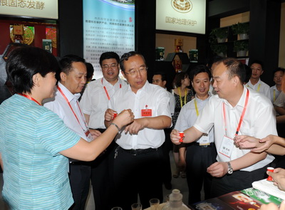 金徽集团董事长周志刚(右)向嘉宾领导介绍“金徽28年生态年份酒”