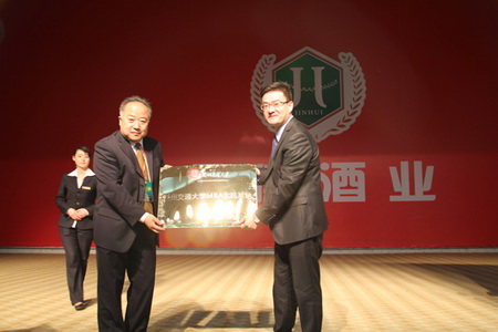 金徽酒业副总经理杜学义宣布兰州交通大学・金徽酒业“MBA移动课堂实践基地”正式成立,在欢快的音乐声中,金徽酒业副总经理王栋从兰州交通大学经管学院院长赵延龙手中接过了“兰州交通大学MBA实践基地”的牌匾,会场上再次响起热烈的掌声。