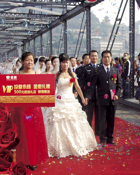 2011年9月12日,一百对新人、一百种祝福,在这个花好月圆的中秋佳节,亘古不变的河流、饱经风霜的铁桥共同见证了这一美丽的永恒时刻。“甘肃省首届公益集体婚礼庆典”大型公益活动在兰州中山铁桥成功举行。作为本次活动的唯一指定用酒,金徽酒业为一百对新人倾情奉上最真挚的祝福和最香甜的美酒。金徽人崇尚忠于婚姻,忠于爱情,忠于家庭的人生观、价值观、社会观。这同时也是金徽酒业作为全省白酒行业领跑者的企业风范,金徽酒讲求原生态、纯酿造、高品质,始终如一的坚持做好酒、做好人,这就如同爱情一般,要做到从一而终,坚贞不渝,才会真正体会到永恒的幸福。原生态酒酿造原生态爱情,爱情同样需要最纯最真的情感,金徽酒为爱情的真谛做出了完美的诠释。
