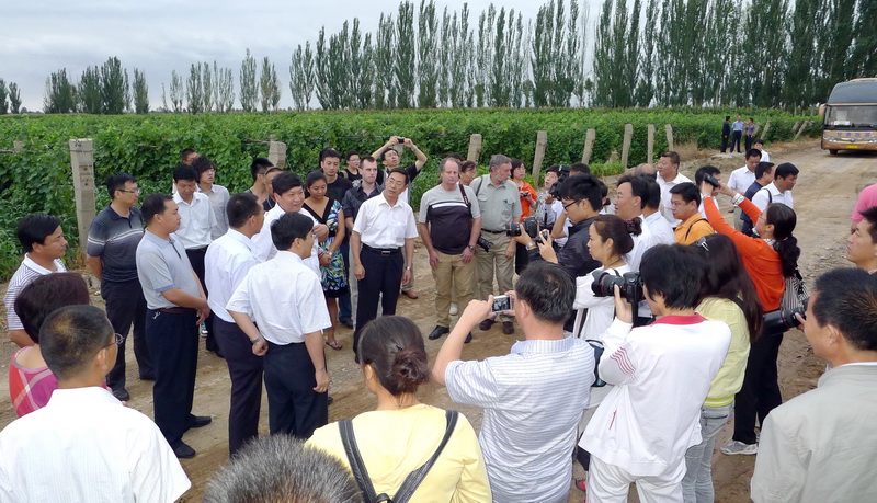 8月16日下午,由来自美国、新西兰、香港、北京、天津、山东、宁夏、新疆等国内外的葡萄酒专家、学者和业界精英共100余人组成的考察团,从兰州出发,来到位于武威黄羊河的莫高葡萄种植基地进行参观考察。武威市委常委、副市长焦军毅引领考察团成员冒着细雨,下到田间到地头参观考察了葡萄种植基地的概况和葡萄的长势。据焦军毅介绍,截止2010年,武威市酿造葡萄酒基地达到10.14万亩,约占全国酿酒葡萄种植面积的10%左右,占全省酿酒葡萄种植面积的65%左右,成为国内十大葡萄酒原料产区之一,2010年产量达到22360吨,实现产值5366万元。产量约占全国酿酒葡萄产量的2%,占全省酿酒葡萄产量的56%,加工企业以威龙、莫高、皇台、石羊河4家龙头企业为主,年加工能力达6.1万吨,加工企业累计上缴税金2.1亿元。