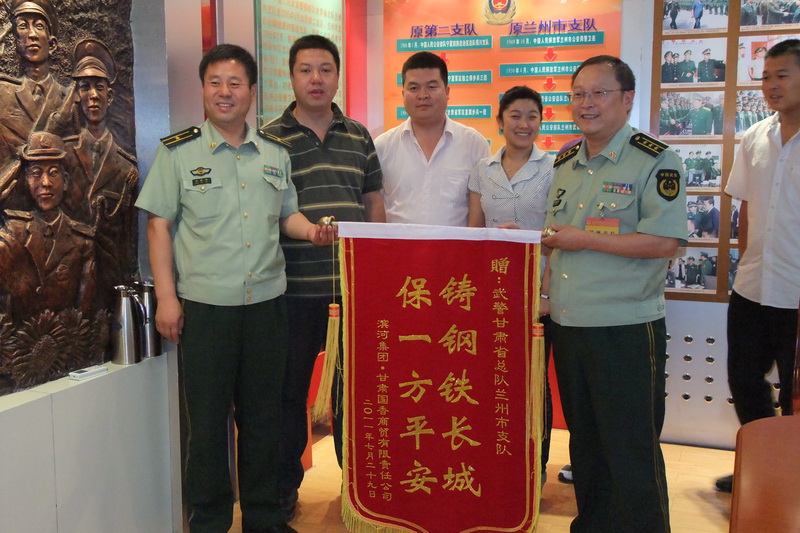 武警兰州市支队是一支光荣的队伍,自成立以来,为甘肃社会经济的发展做出了巨大的贡献。保一方平安,净一片蓝天,时刻为陇原的平安稳定枕戈待发。在慰问仪式上,九味国香品牌营销公司员工代表首先介绍了九味国香酒品及公司的基本情况并深情发言:部队是陇原人民的坚强后盾,哪里最危险、哪里最需要、哪里最艰苦,哪里就有我们可爱的人民子弟兵。部队官兵发扬拥政爱民的光荣革命传统,把驻地当故乡,视人民如父母,积极投身地方经济社会建设,为我们创造了和平安康的社会经济环境;面对烈火和洪水,面对汶川地震和玉树地震,面对各种突发性社会事件,你们冲锋在前、毫不畏惧,召之即来、来之即战、战之即胜,为了人民群众的生命和财产安全不畏艰险,赴汤蹈火,表现出大无畏的革命英雄气概,充分展现了新时代人民子弟兵为人民服务的良好形象。滨河集团九味国香品牌营销公司将一如既往地支持部队建设,继续发扬拥军优属的光荣传统,军民团结一心,共建美好家园。祝广大官兵在“八一”节日来临之际,身体健康、合家欢乐。