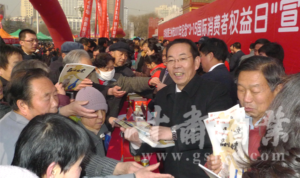 本刊讯(记者:雨辰) 3月15日上午,由省委宣传部、省精神文明办、省工商局、省消费者协会联合主办的“甘肃省2011年‘3・15’国际消费者权益日宣传咨询服务活动”在全省正式启动。省委常委、副省长刘永富宣布宣传服务活动开始,省政协副主席李永军等省级有关部门领导出席了启动仪式。甘肃省酒类商品管理局局长陈浦、副局长李河,兰州市酒类商品管理局局长王祖国等有关单位参加了活动并积极向群众散发宣传资料,接待群众咨询。