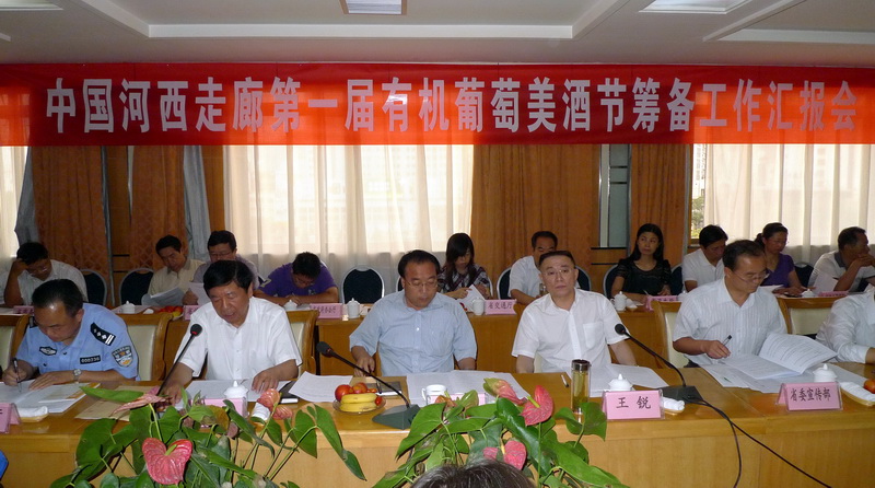 8月15日至30日,中国河西走廊第一届有机葡萄美酒节将在兰州、武威、张掖、嘉峪关、酒泉、敦煌等市同时举办。8月5日,第一届有机葡萄美酒节组委会在兰州召开筹备工作进展情况汇报会,对节会进行开幕前的总动员。甘肃省人民政府副秘书长李志勋代表省委常委、常务副省长刘永富发表重要讲话,省商务厅厅长王锐主持会议,省葡萄酒产业协会会长王玉武汇报节会筹备情况,省直、省属有关单位领导、河西五市政府领导以及产区企业领导参加了会议。