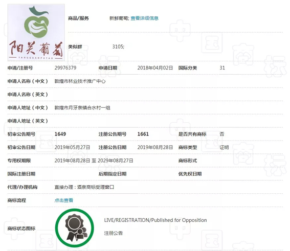 近日,从国家知识产权局商标局传来喜讯,酒泉市“阳关葡萄”正式获批地理标志证明商标。这是继“酒泉洋葱”、“瓜州枸杞”、“敦煌李广杏”和“哈尔腾羊肉”成功注册之后,该市获得的第5张“国字号金名片”。