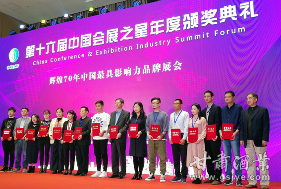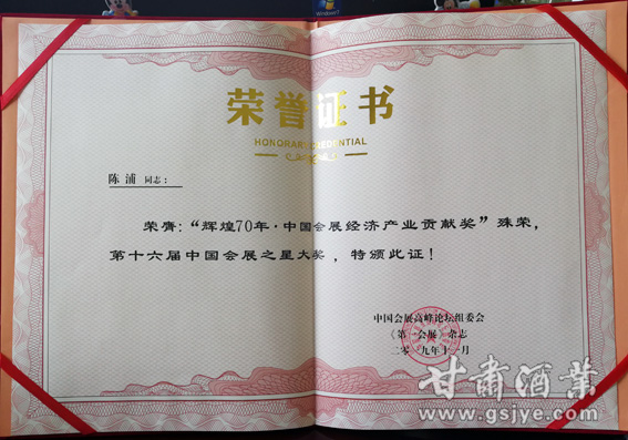 甘肃酒业网讯(文:科 敏 图:白 杨)值此第二届上海进口博览会召开之际,由中国会展经济研究会、《第一会展》杂志、中国会展联盟、各省市会展行业协会联合主办的2019年中国会展行业高峰会(CCESF)暨合作交流大会 —— 中国品牌会展联盟、中国会展行业精英俱乐部成立大会,第十六届中国会展之星颁奖典礼于11月7日在上海隆重举行!中国·河西走廊有机葡萄美酒节荣膺“辉煌70年·中国最佳节庆活动奖”,陈浦荣膺“辉煌70年·中国会展经济产业贡献奖”。