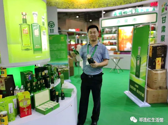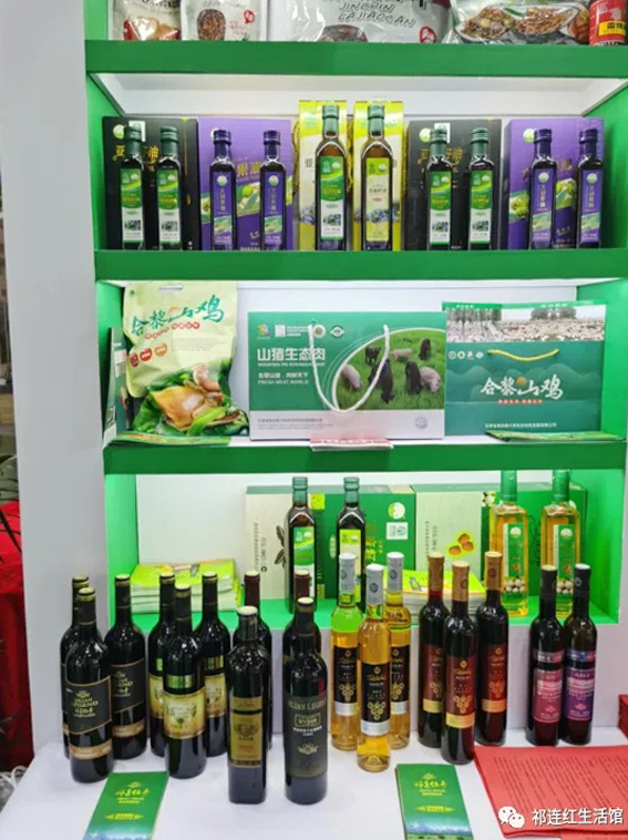 (图为金张掖展区的祁连传奇葡萄酒及亚麻籽油)