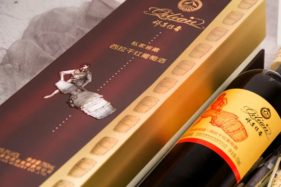 入选的西拉干红葡萄酒包装则属于祁连传奇干红中的“私家窖藏”系列。该系列产品包装最为独特的设计是采用了手绘的葡萄酒古法酿造工艺流程中酿酒人摇桶的形象。这一图案的设计灵感来自河西走廊久远的葡萄酒酿造历史。包装盒正中手抬酒器,倾身用力的酿酒人形象栩栩如生,边缘的橡木桶图案既与主要图案呼应,体现出该款干红产品在酿造过程中经历了橡木桶陈酿,品质上乘。