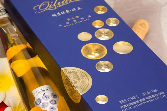 其中:贵人香冰白和美乐冰红同属现有冰酒产品中的“珍冰”系列。在包装盒表面,除醒目的品牌logo、品名、生产商信息外,珍冰系列产品包装最大的的亮点是由11枚圆形组合。该组合图案整体看来像是洒下金黄色的冰酒液珠,迎合了大众对冰酒色泽的印象。近看,这些圆形采用了独特的镭射立体感镜面工艺,其中分别印入6个图案,用来分别表示祁连传奇品牌葡萄酒普遍具备的品质优势:自产原料、雪水灌溉、原汁纯酿、葡萄糖份、有机酿造、金奖品质。在这些共有的设计元素下层,冰白、冰红产品包装又分别采用蓝色与黑色卡纸裱糊,来区分葡萄原料的不同。珍冰系列冰酒选用375mL高樽白料玻璃瓶,酒塞选用了整块天然橡木塞,酒标只占据瓶身的很小部分,留出大部分区域突出酒液的纯正。独特设计和工艺的包装盒、水晶般剔透的酒瓶,充分表现出冰酒产品高端、时尚的品类特点。