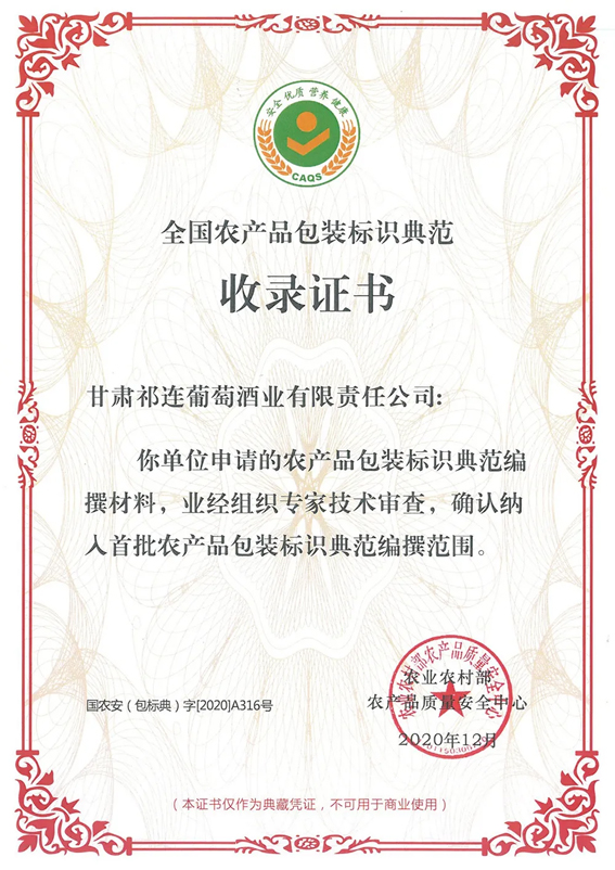 为推进农产品科学包装、清晰标识和通过包装标识全方位彰显展示农产品独有品质特性,实现农产品生产、物流、加工、消费包装标识生态、环保、优质化,2020下半年,农业农村部农产品质量安全中心组织了“2020年度农产品包装标识百佳典范”征集活动。在张掖市高台县农业农村局的推荐下,甘肃祁连葡萄酒业有限责任公司将“祁连传奇”品牌葡萄酒目前使用的3款产品包装进行登录,参与此次活动。时至2020年底,公司收到主办方通知:经过本次活动组织的专家评审,祁连酒业登录的设计材料被确认纳入首批农产品包装标识典范编撰范围。