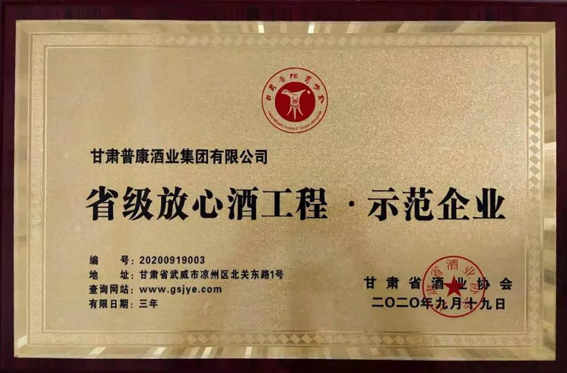 2020年9月,在河西走廊第十届有机葡萄美酒节上,经甘肃省酒业协会、甘肃省葡萄酒产业协会考核评议,经过历时近9个多月的严格筛选和审核,普康酒业集团被授予“省级放心酒工程·示范企业”荣誉称号。