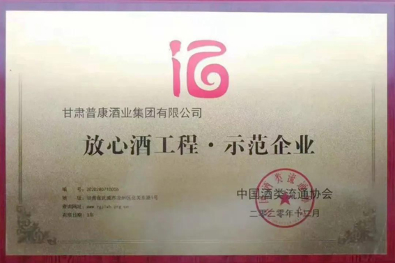 2020年12月,在中国酒类流通协会酒类营销数字化高峰论坛暨放心酒示范工程授牌仪式上,普康酒业集团被授予“国家级放心酒工程?示范企业”荣誉称号。