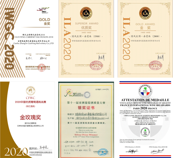 2016年,荣获新酒优胜奖第一名;2017年,荣获CWE首届河西走廊杯国际葡萄酒大赛优质奖;2017年,荣获帕尔国际葡萄酒大赛金奖;2018年,荣获国家级放心酒工程·示范企业的荣誉称号;2018年,荣获中国优质葡萄酒挑战赛新酒优胜奖;2018年,荣获甘肃省科技进步二等奖;2019年,荣获第十届亚洲葡萄酒质量大赛金奖;2019年,荣获法国有机葡萄酒大赛银奖;2020年,荣获2020国际葡萄酒(中国)大奖赛金奖;2020年,荣获法国国际有机葡萄酒大赛奖银奖;2020年,荣获国际领袖产区葡萄酒/烈酒质量大赛金奖;2020年底,国风2020年桃红葡萄酒获桃红酒品类金玫瑰奖……国风庄园在国际大奖赛崭露头角已不足为奇,这也不断提高了中国消费者对中国葡萄酒信任感、对中国葡萄酒文化的归属感、对中国葡萄酒品质与品牌的自豪感。