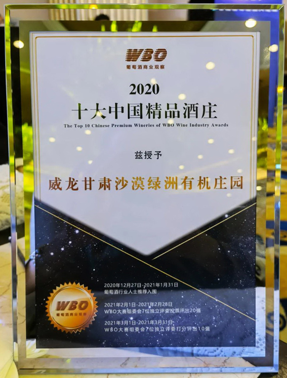 威龙甘肃沙漠绿洲有机葡萄庄园凭借卓越的品质和有机种植管理体系,已连续两次获得“十大中国精品酒庄”殊荣。威龙葡萄酒股份有限公司董事、副总经理赵子琪(右二)代表威龙上台领奖。