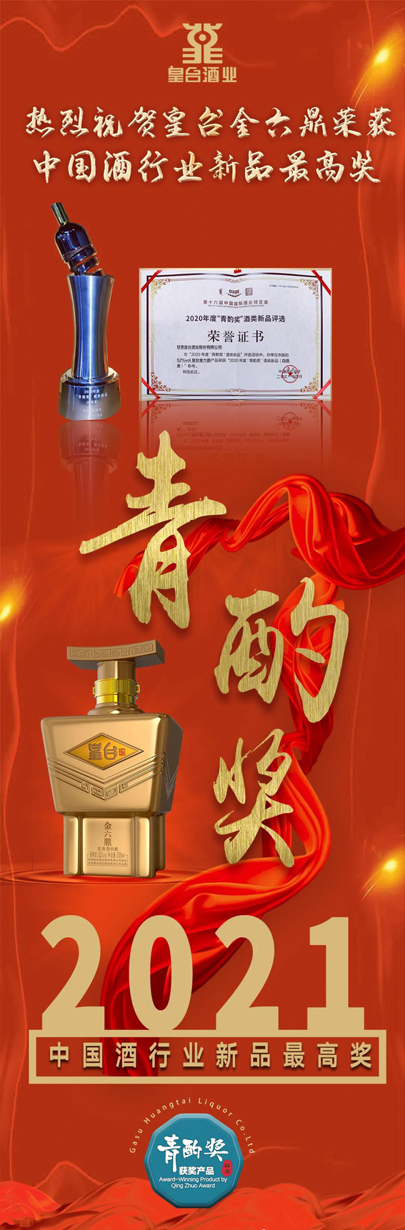 2021年4月,皇台金六鼎斩获2020年度中国酒业行业最高奖——“青酌奖”。这是继2019年6月皇台窖底原浆18斩获“青酌奖”之后,皇台酒再度获得的至高荣誉。皇台酒业成为甘肃省内唯一连续两届获得“青酌奖”殊荣的酒企”。