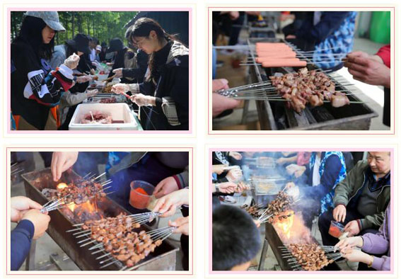 到了中午,大家按组领到食材工具等,便开始分工合作,生火、洗菜、穿串、烤制……每个人都忙得不亦乐乎,享受着“自己动手,丰衣足食”的自在与惬意!