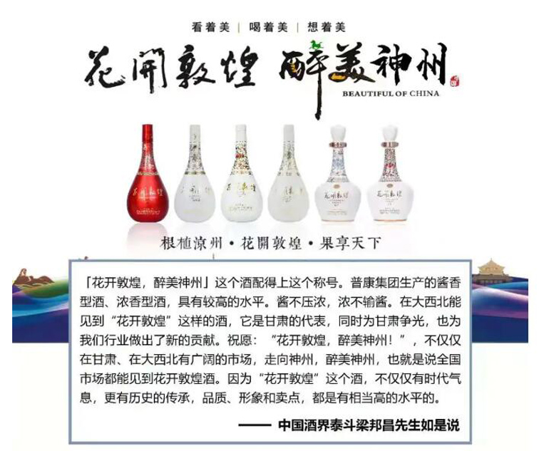 深耕地方酒业的甘肃普康酒业,历时5年精心打磨丝路文化礼宾酒 — 花开敦煌,以敦煌文化为魂,借助现代营销方式将敦煌元素融入当代生活,迎合了消费升级大背景下的全新文化需求,是将极致品质融合在生动的白酒体验文化当中。