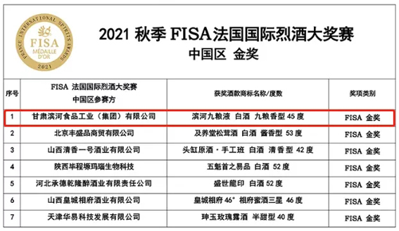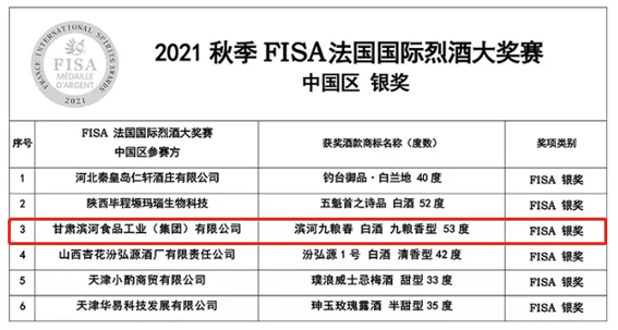 在本次大赛中,甘肃滨河集团旗下滨河九粮液、滨河九粮春2款产品凭借其酒体丰满,窖香浓郁、绵甜净爽、回味悠长等特点,与国内、外众多知名烈性酒进行的巅峰对决中,独占鳌头。其中,滨河九粮液荣获法国国际烈酒大奖赛金奖,滨河九粮春荣获法国国际烈酒大奖赛银奖!