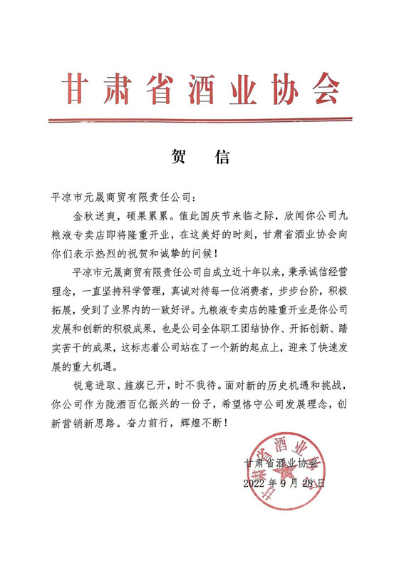 【原创】甘肃酒业网讯:金秋送爽,硕果累累。2022年9月29日,值此国庆佳节来临之际,甘肃省酒业协会常务理事单位、平凉市酒业协会副会长单位、平凉市元晟商贸有限公司——“九粮液专卖店”盛大开业。甘肃省酒业协会发贺信及会同甘肃义顺集团送花篮以示祝贺。