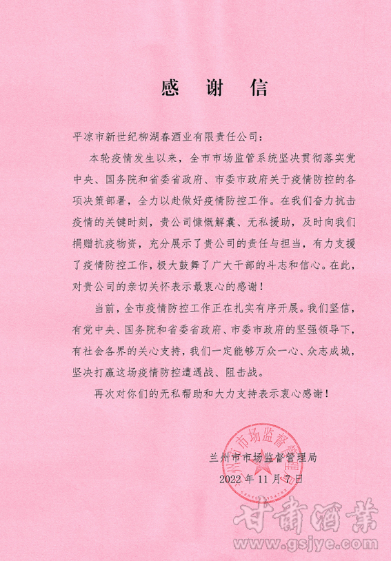 真情温暖你我,大义守望相助。自新冠疫情发生以来,平凉新世纪柳湖春酒业公司始终心怀桑梓,回报社会,义不容辞承担起自己的社会责任,先后组织多次参与平凉本地疫情防控支援工作,多次为抗疫前线捐赠物资用品,体现崆峒酒人高度的社会责任感和使命感。本次疫情的省城兰州抗疫压力剧增,面对严峻形势,平凉新世纪柳湖春酒业公司作为“甘肃酒类好品牌”企业,响应号召、闻令而动,一如既往地为疫情防控作出自己应有贡献,惟愿抗疫胜利,静待春暖花开!