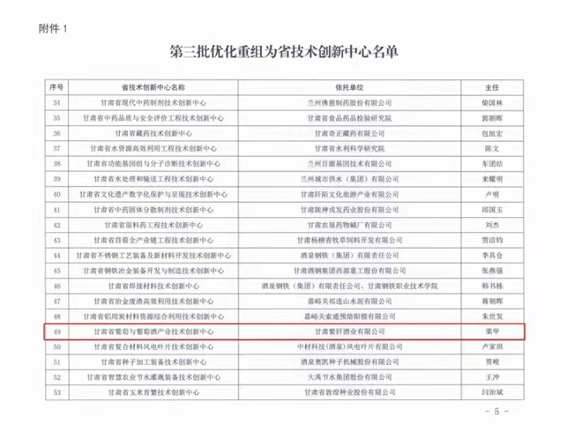 为贯彻落实《甘肃省强科技行动实施方案(2022-2025年)》,根据《甘肃省科技创新基地平台管理办法》(甘科技规【2022】7号)要求,经依托单位自评、制定重组方案、实地考察、综合答辩评审、会议评审和公示等程序,第三批重组省级技术创新中心共72家,其中在甘肃省葡萄与葡萄酒产业发展方面,紫轩酒业为唯一入选企业。