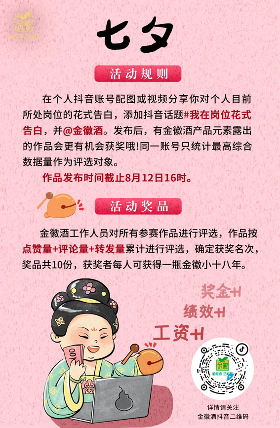 在个人抖音账号配图或视频分享你对个人目前所处岗位的花式告白,添加抖音话题#我在岗位花式告白,并@金徽酒。发布后,有金徽酒产品元素露出的作品会更有机会获奖哦。