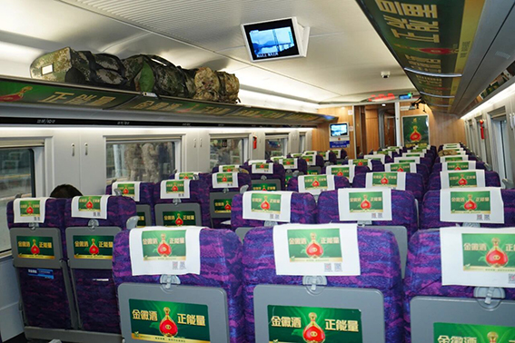 金徽酒高铁专列采用全场景媒体覆盖模式,通过外车身彩贴、车门海报、行李架天幕、头枕巾、语音播报等八大传播形式,打造沉浸式品牌体验空间,让乘客在旅途全程感受金徽酒的生态酿造理念与文化底蕴。