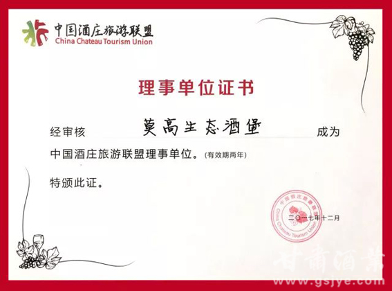 2017年12月9日,中国食品工业协会葡萄酒果酒专家委员会组织成立中国酒庄旅游联盟,成立仪式在吉林省通化产区集安市紫都苑宾馆举行。莫高生态酒堡凭借其旅游条件、稳定的产品质量、消费者良好的口碑等条件,经联盟会组织审核成为中国酒庄旅游联盟理事单位,成为河西走廊产区唯一的成员。