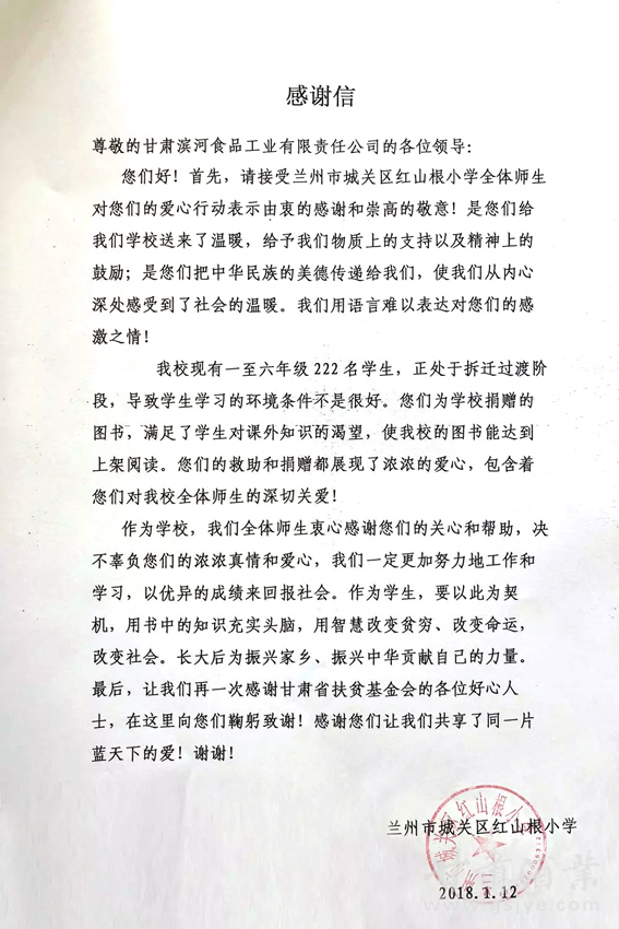 本次活动受到甘肃省各、市、州、村、镇学校和师生的热忱欢迎,体现了社会各界对贫困中小学生的关心爱护。城关区红山根小学特地发来感谢信,表示绝不辜负滨河集团的浓浓真情和爱心,决心更加努力地工作与学习,以优异的成绩来回报社会。