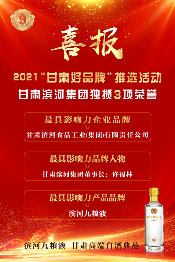 据悉,2021年度“甘肃好品牌”榜评选活动一如既往严格按照公平、公开、公正的原则进行,首先通过前期调查摸底确定了候选单位,然后经过品牌数学模型评测、微信投票和品牌专家委员会评分,最终评选出榜单。经过初审、初评、终评、公示等环节,甘肃滨河集团荣获“最具影响力企业品牌”;甘肃滨河集团董事长许福林先生荣获“最具影响力品牌人物”;甘肃滨河集团旗下品牌滨河九粮液荣获“最具影响力产品品牌”。甘肃滨河集团两度获得甘肃好品牌称号,并成为本届评选活动中斩获荣誉最多的企业,独揽3项荣誉!