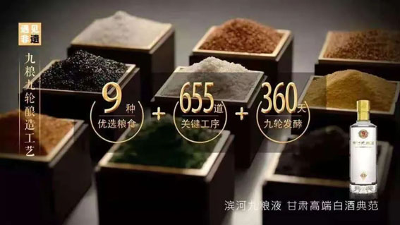 滨河九粮液拥有独创的具有自主知识产权的“九粮九轮工艺”,是在秉承汉代“九酝春酒法”,兼收并蓄浓、酱、清等多种香型工艺精髓的基础上,融汇现代生物酿造新技术而创建的拥有自主知识产权的专利工艺。其核心的商业竞争价值就在于开创了中国酒坛又一白酒香型——九粮香型,一举改写了甘肃没有自主香型的酿造历史。