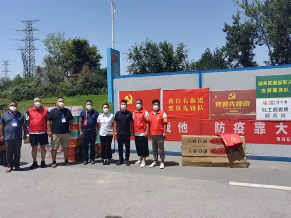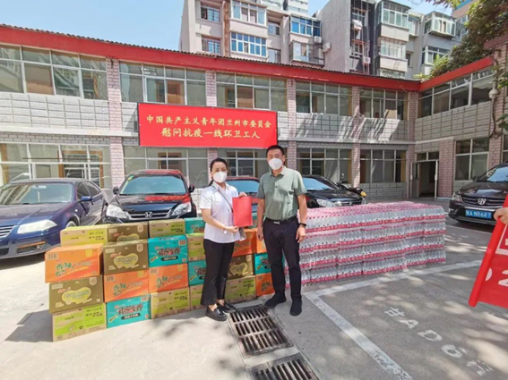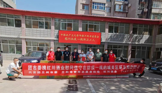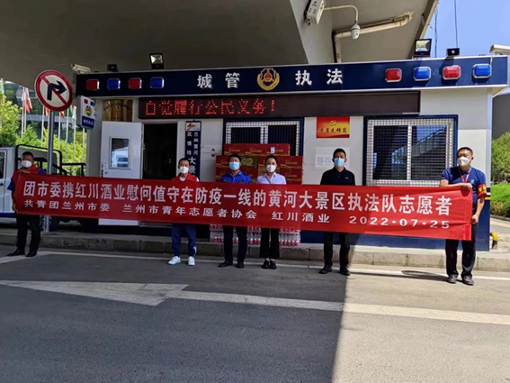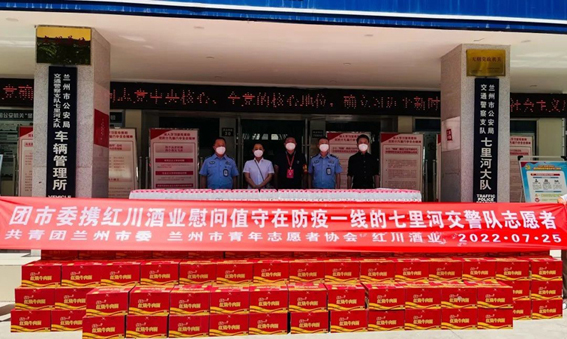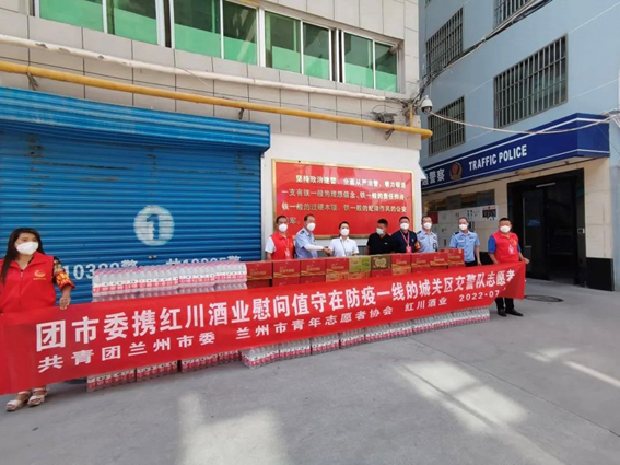 7月25日,共青团兰州市委、兰州市青年志愿者协会携手红川酒业慰问七里河交警大队、城关交警大队、大景区管委会执法大队、城关区环卫局、青白石街道碧桂园卡口点等防疫一线的交警、环卫工人、执法人员、社区工作者和志愿者,将1000件矿泉水、500件方便面和50件方形遮阳伞等价值近10万元的物资送到他们手中。