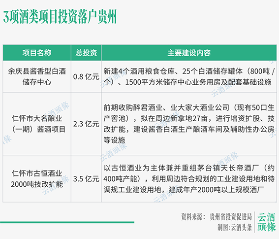 5月19日,贵州省投资促进局发布3项酒类项目,总投资6.6亿元。(贵州省投资促进局)