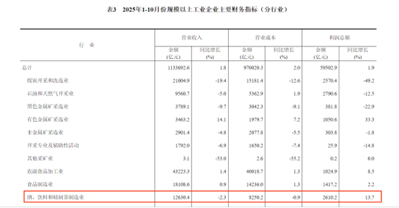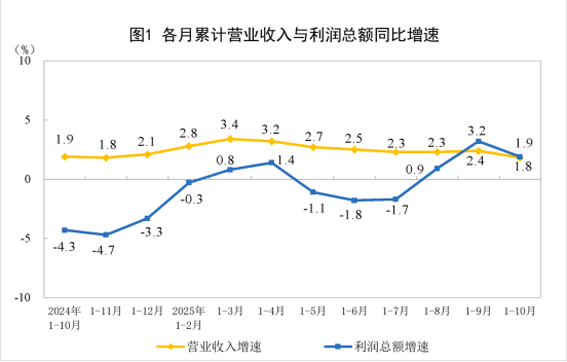 11月27日,国家统计局发布2025年1-10月份全国规模以上工业企业相关经济效益数据。