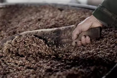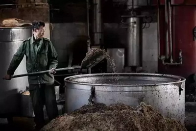 “从一粒粮食到一滴白酒,是古人的文化和智慧的结晶。此过程为润料,酿酒师将新料、酒糟、辅料及水配合在一起,为糖化和发酵打基础。”