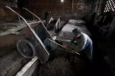 “酿酒人将冷却后的酒糟搅拌,扬渣,之后还要同时加入曲子和酒母。”