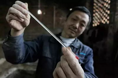 “发酵期间,首先要做好清窖,其次要注意发酵酒醅的温度变化情况,要控制在15摄氏度左右,温度过高或者过低都会影响酒的质量。酿酒人正在对酒醅的温度进行测量。”