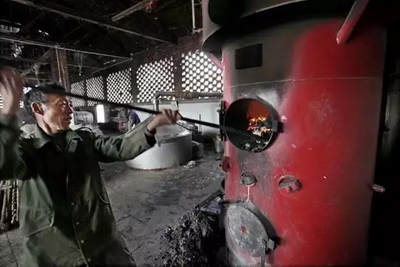 “酿酒人在把握好火候,对蒸锅内的醅料进行热蒸。通过蒸酒把醅中的酒精、水、高级醇、酸类等有效成分蒸发为蒸汽,再经冷却即可得到白酒。”