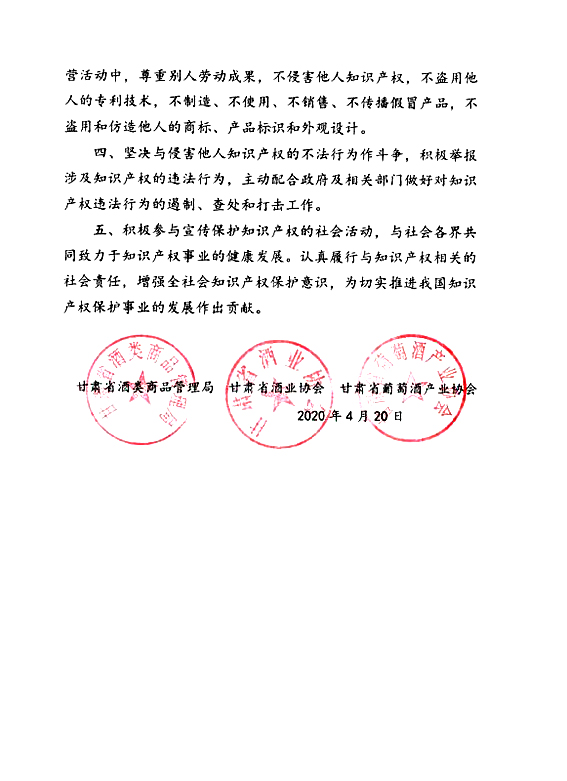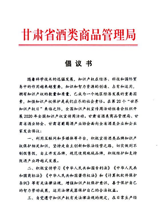 为广泛增进人们对知识产权的认识,根据中国和阿尔及利亚共同提出的倡议,WIPO的成员国在2000年选择4月26日——1970年《WIPO公约》生效的日子——为世界知识产权日。今年4月26日是第20个世界产权知识日,今年的主题是“为绿色未来而创新”。WIPO指出,要探讨平衡而强大的知识产权制度如何支持绿色经济的兴起;要探究专利制度如何促进创新,如何推动环境友好型技术的发展和传播;要研究商标和其他标志如何支持着眼于环境可持续性原则的企业的出现和发展,如何帮助它们提供范围更广的环保产品和服务;要探索诸如地理标志之类的权利如何鼓励更可持续的自然资源利用方式。为此,甘肃省酒类商品管理局、甘肃省酒业协会、甘肃省葡萄酒产业协会,向全省酒类企业和企业家倡议,号召支持绿色经济的兴起,积极维护和支持陇酒产业跨越式发展。